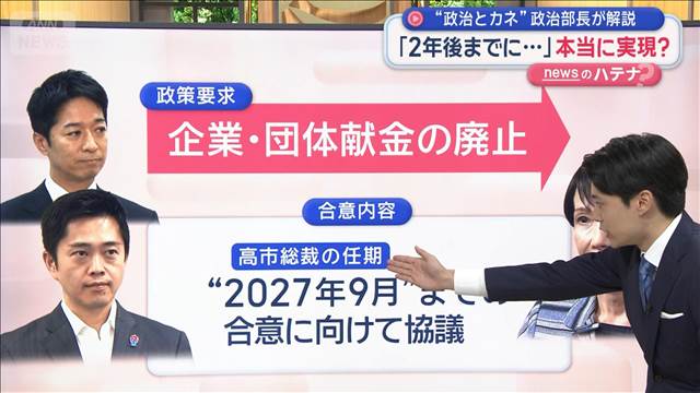 「政治とカネ」はどう折り合ったのでしょうか。企業団体献金の廃止について「2年後までの合意に向け協議する」とした自民党と日本維新の会ですが、この協議に込められた意味について山本志門政治部長の解説です。