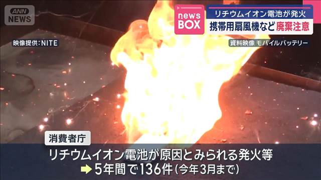 消費者庁によりますと、リチウムイオン電池が原因とみられる携帯用扇風機、ワイヤレスイヤホン、スマートウオッチの発火などは今年3月までの5年間で136件起きています。