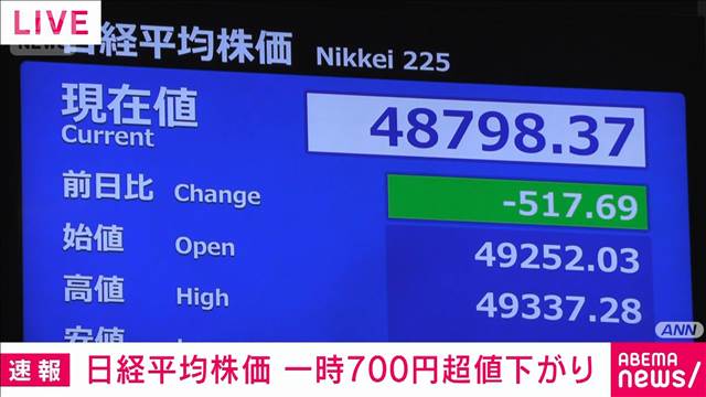 【速報】日経平均株価 一時700円超値下がり 高値への警戒と米ハイテク下落受け