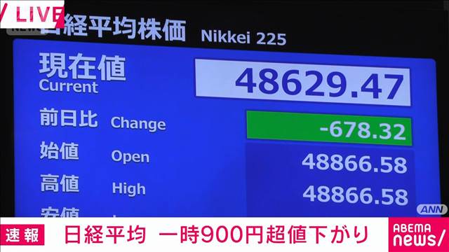 【速報】日経平均株価 一時900円超値下がり