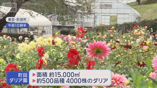 東京・町田市にあるダリア園。関東最大の面積を誇る、およそ500品種、4000株のダリアが見頃を迎えています。