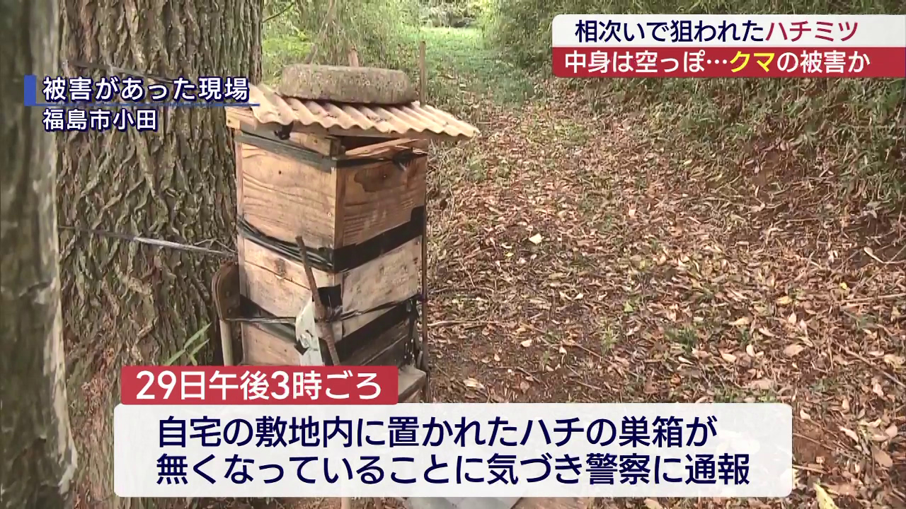 クマの目撃情報やけが人が相次ぐ県内。福島市では29日から30日にかけてあるものが狙われました。クマと見られる動物に狙われたのは、甘い香りを放つハチミツ。29日午後3時半ごろ、福島市小田の住宅の敷地に置かれていたハチの巣箱が無くなっていることに気づき、...
