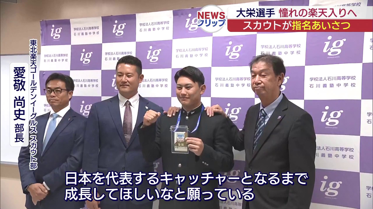 学法石川高校野球部の大栄利哉選手が、東北楽天ゴールデンイーグルスの関係者からドラフト指名の挨拶を受けました。「グラウンドで守っている時の立ち振る舞いというか、相手チームに対する配慮とか気づかいとかそういうところを見て、これは良い選手だなという印象を受...