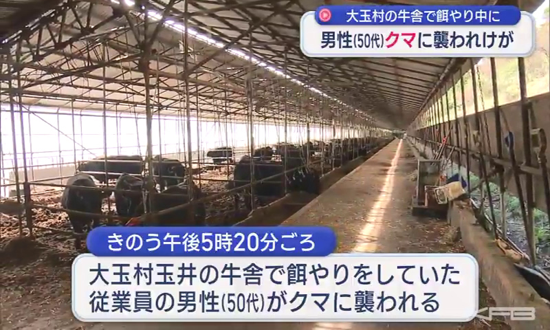 警察によりますと10月31日夕方、大玉村玉井の牛舎で餌やりをしていた50代の男性がクマに襲われました。男性は後頭部や左腕などにけがをして病院に運ばれましたが、意識はあるということです。当時、牛舎の近くでは体長1メートルを超えるクマ2頭が目撃され、この...