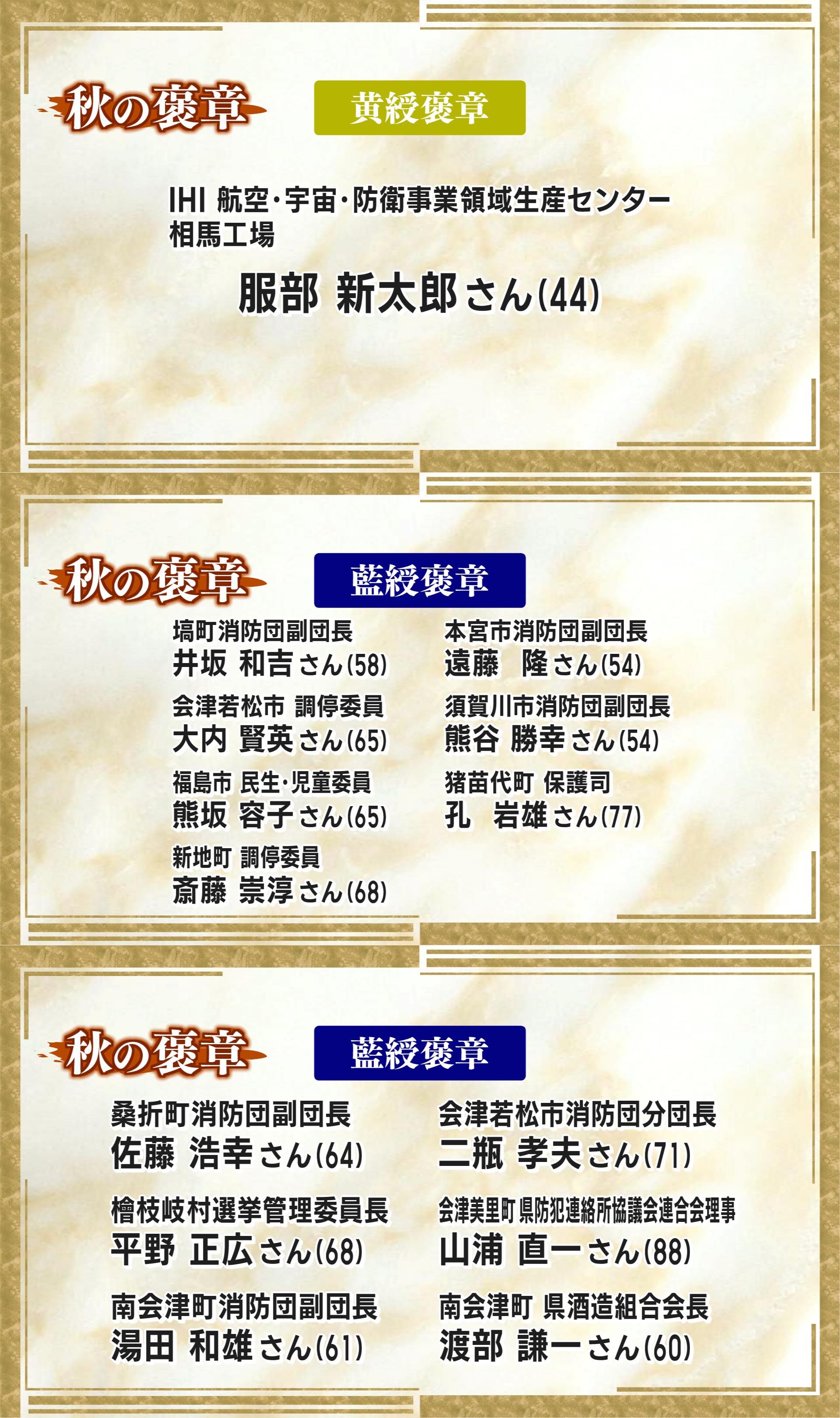 秋の褒章の受章者が発表され、県内からは14人が選ばれました。県内から選ばれたのは、仕事に励み一般の人たちの規範となった人に贈られる黄綬褒章が1人、公共の利益に力を尽くした人に贈られる藍綬褒章が13人の計14人です。黄綬褒章は、重工業大手IHIグループ...
