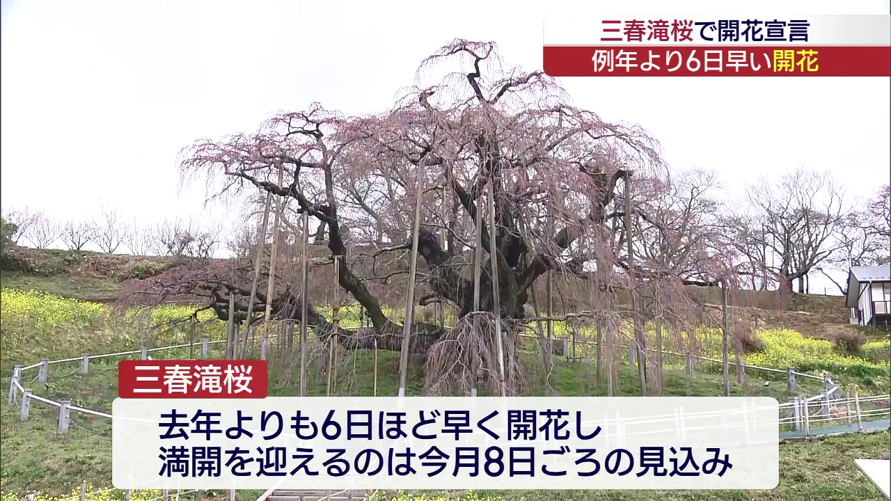 日本三大桜の三春滝桜が2025年よりも6日早く開花しました。三春滝桜は開花の基準である5輪以上が咲いていることが確認されたため、2日に開花が宣言されました。開花宣言した三春町の坂本浩之町長のおすすめは「3分咲き」。満開になると全体的に白くなるが、3分...