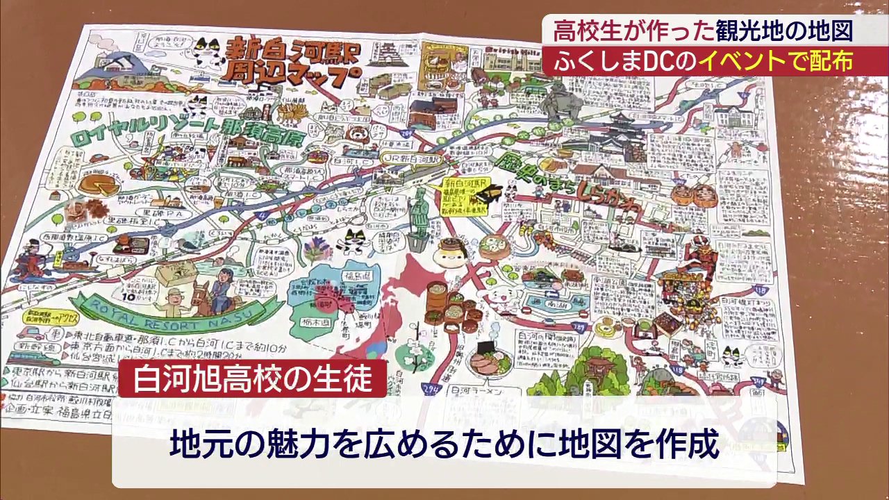 ふくしまDCに合わせて2日は高校生が作成した観光地の地図もお披露目されました。この地図は白河旭高校の生徒たちが地元の魅力を広めるために作ったもので、白河市の鈴木市長に完成を報告しました。作成した生徒たちは昨年度の授業で「なぜ、白河市への観光客は少ない...