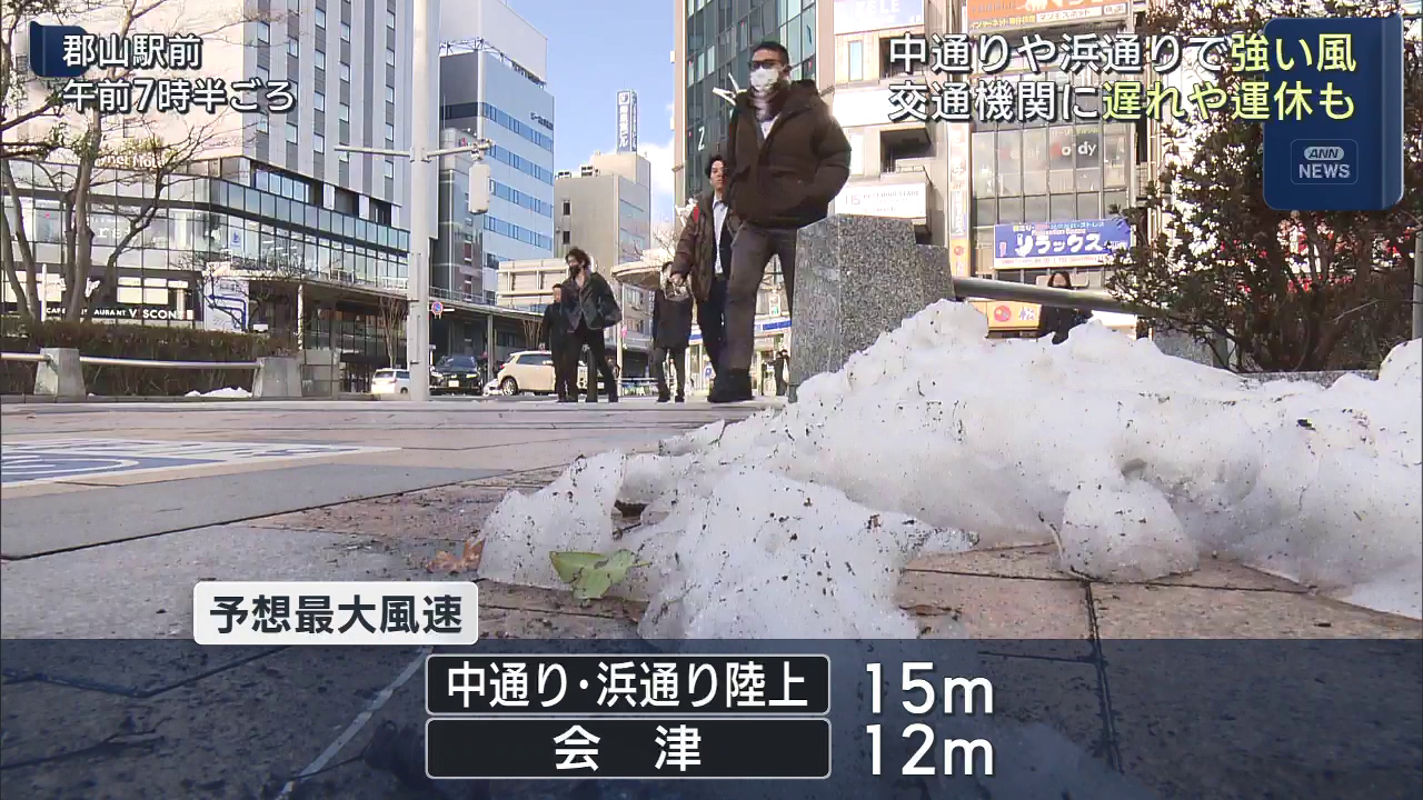 県内では中通りと浜通りで強い風が吹いていて、一部の列車で運休も出ています。 県内は発達した低気圧の影響により、中通りと浜通りの陸上では、最大風速が15メートルと予想されています。 この風の影響により磐越西線の郡山と会津若松の間の上下線で、一部の列車...