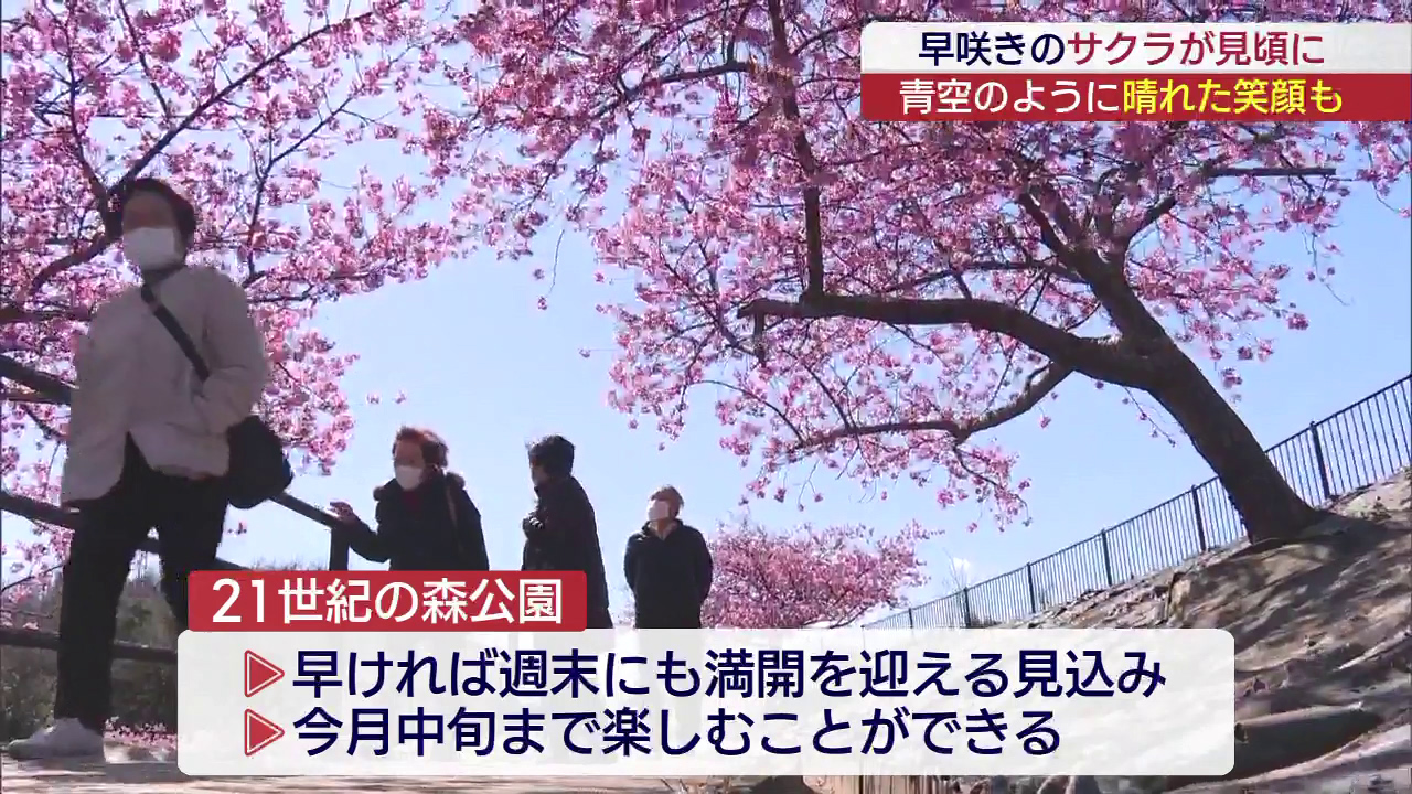 青空に映えるピンク色の花びら。いわき市の21世紀の森公園では、早咲きで知られる河津桜が早くも見頃を迎えています。 およそ50本の木が斜面に植えられていて、さまざまな角度からサクラを見ることができます。公園には多くの人が訪れ、写真を撮るなどして楽しん...