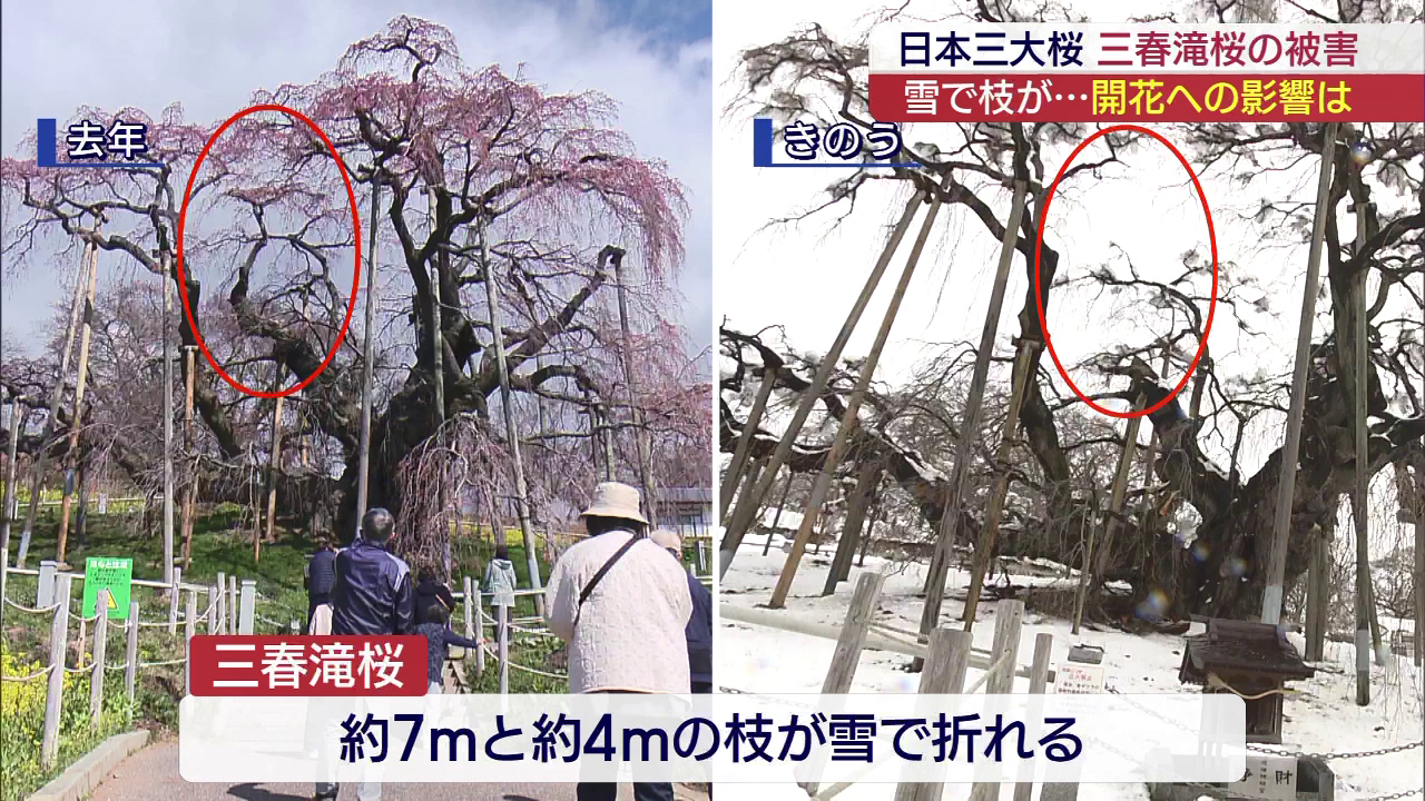 国指定天然記念物で日本三大桜の一つとして知られ、毎年春には多くの人を楽しませる三春滝桜。4日の雪で、長さ7メートルほどの枝と、長さ4メートルほどの枝の合わせて2本が折れました。 5日は樹木医が現地を訪れ、枝が折れた原因の分析や今後の処置を決めるため...
