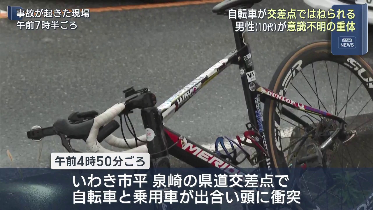 20日朝早く、いわき市の交差点で自転車が乗用車にはねられて、乗っていた男性が意識不明の重体です。警察によりますと午前4時50分ごろ、いわき市平 泉崎の県道交差点で、自転車と乗用車が出会い頭にぶつかりました。この事故で、自転車に乗っていた10代の男性が...
