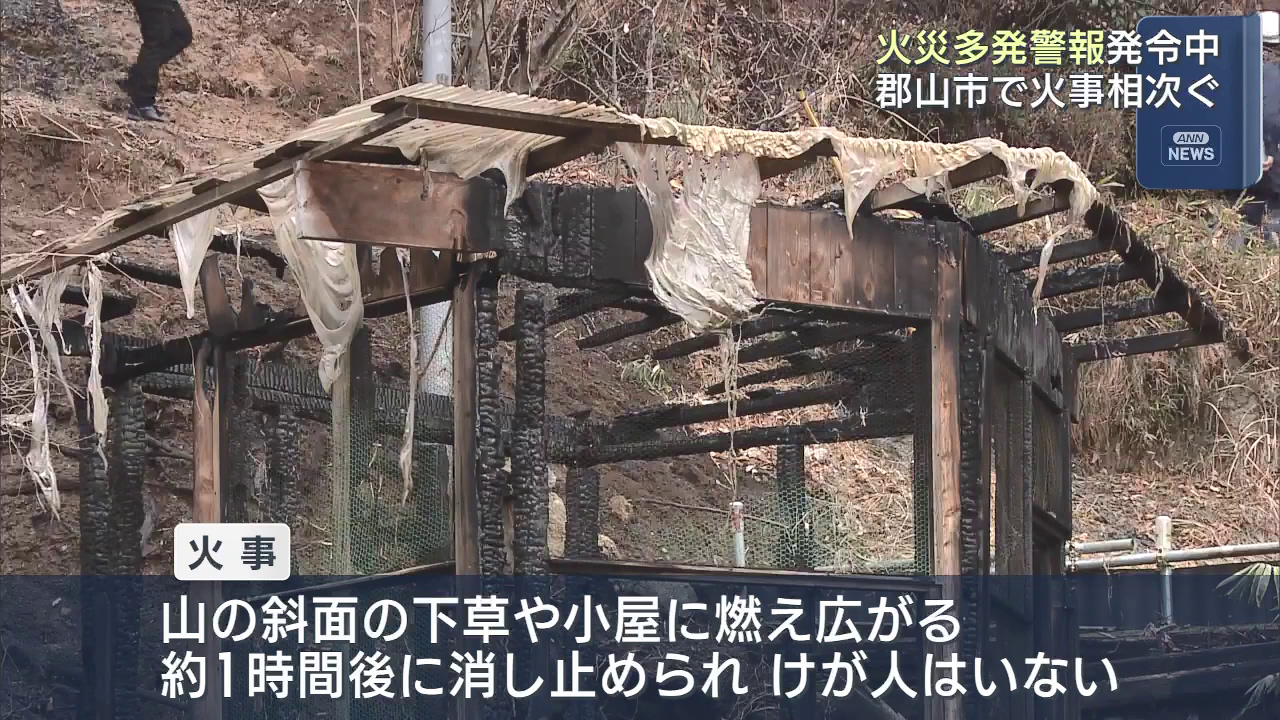 火災多発警報が出されている郡山市で火事が相次ぎ、火の取り扱いへの注意が呼び掛けられています。警察と消防によりますと、22日午後10時半ごろ、郡山市田村町で「山が燃えている」と消防に通報がありました。火は山の斜面の下草や近くの小屋などに燃え広がりました...