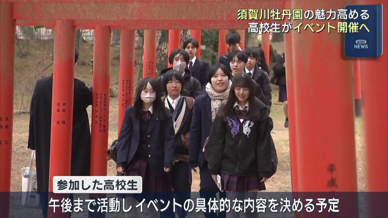 県内の高校生が、国が指定する名勝・須賀川牡丹園の魅力を発信する取り組みを行っています。須賀川市や郡山市の高校生約60人が参加したのは、須賀川牡丹園の来園者を増やそうと須賀川市が企画したワークショップで、1月から準備を進めていました。参加した高校生は、...