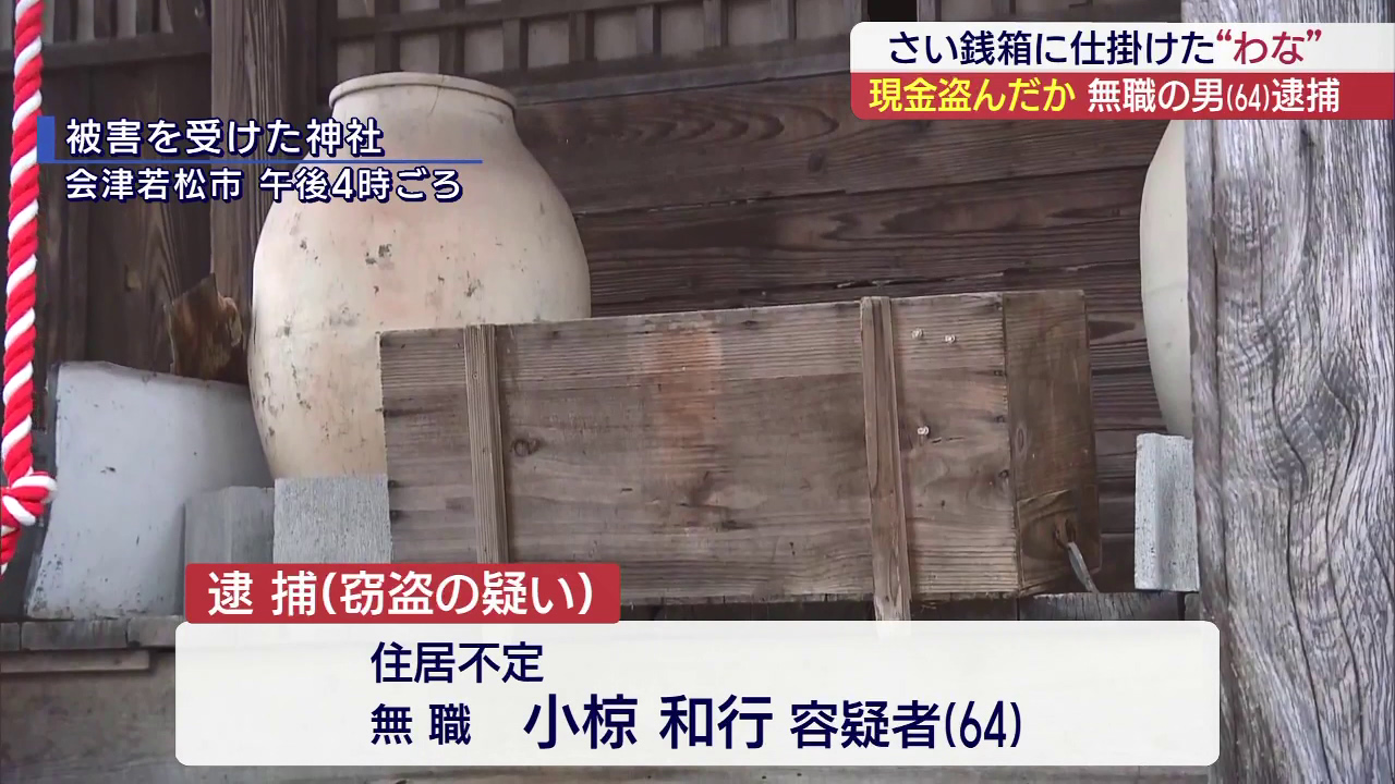 会津若松市の神社にあるさい銭箱から現金を盗んだ疑いで、64歳の無職の男が逮捕されました。窃盗の被害が相次いでいた神社では、さい銭箱に「わな」を仕掛けていました。警察によりますと、住居不定・無職の小椋和行容疑者(64)は、23日未明、会津若松市の神社に...